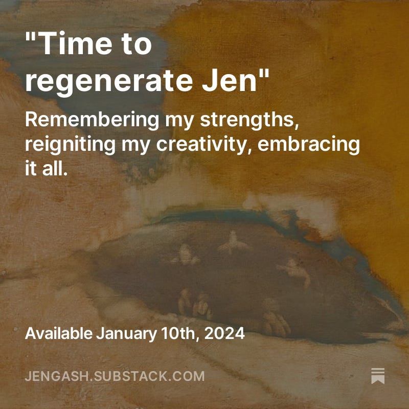 Jen is regenerating....Regeneration is not just needed in nature or healthcare, but for individuals too!Jen GashJan 10, 2024Sharehttps://open.substack.com/pub/jengash/p/time-to-regenerate-jen?r=eisp5&utm_campaign=post&utm_medium=web&showWelcome=trueSubscribeThanks for reading Alchemical Health! Subscribe for free to receive new posts and support my work.SubscribePreviousNext
